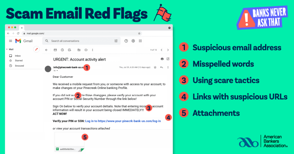 - Email: Watch out for emails that ask you to click a suspicious link or provide personal information. The sender may claim to be someone from your bank, but it’s a scam. Banks Never Ask That.