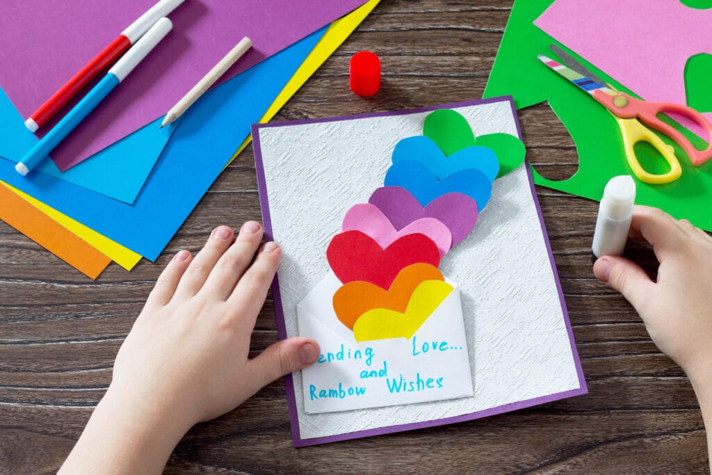 All you need is construction paper, small envelopes, markers, glue and scissors. Cut our hearts with different color construction paper and arrange into a rainbow.